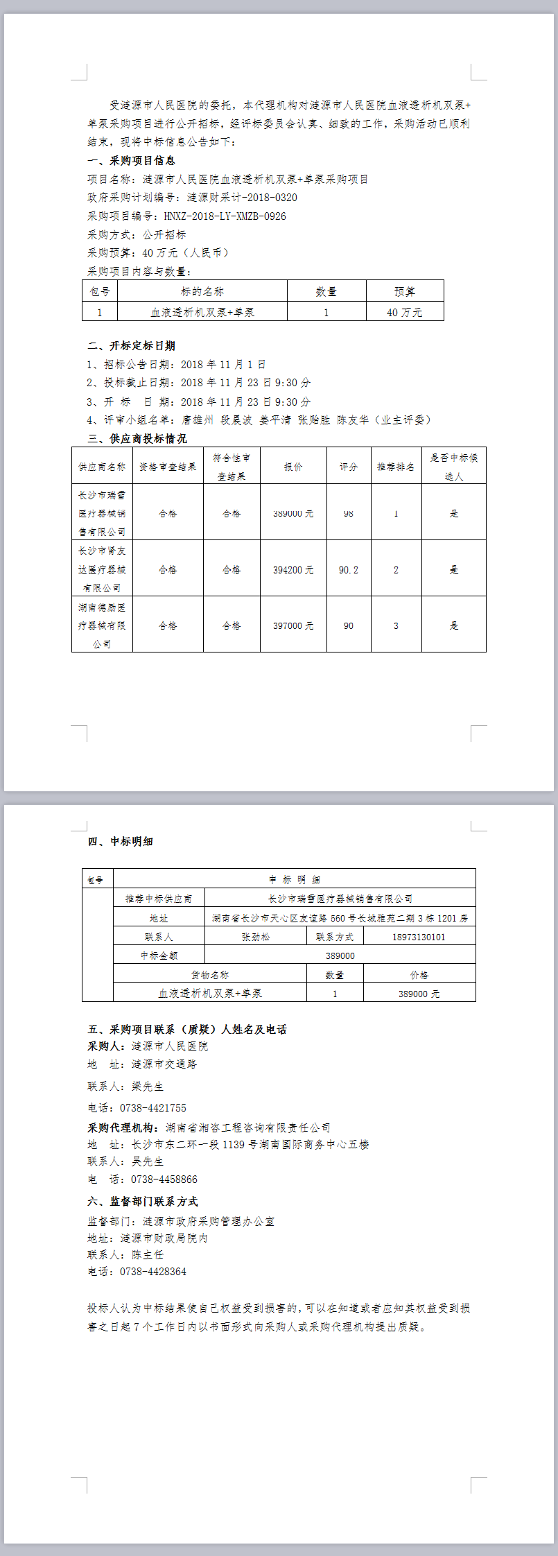 漣源市人民醫(yī)院血液透析機(jī)雙泵+單泵采購項(xiàng)目中標(biāo)結(jié)果公告