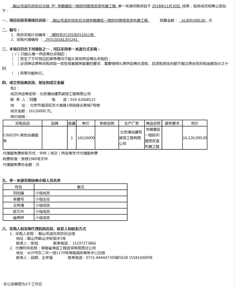韶山毛澤東同志紀(jì)念館專題展區(qū)一樓陳列提質(zhì)改造布展工程單一來源采購成交公告