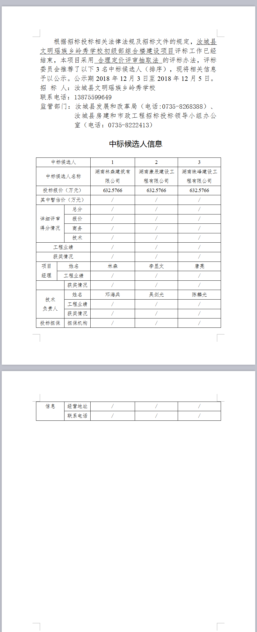 汝城縣文明瑤族鄉(xiāng)嶺秀學(xué)校初級部綜合樓建設(shè)項(xiàng)目中標(biāo)候選人公示
