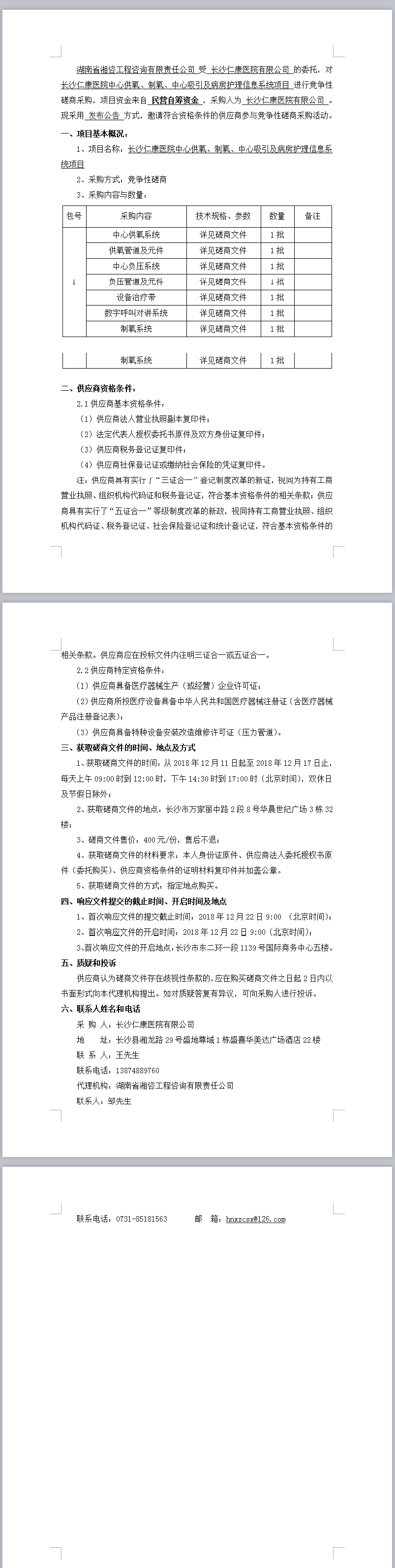 長沙仁康醫(yī)院中心供氧、制氧、中心吸引及病房護(hù)理信息系統(tǒng)項(xiàng)目磋商邀請公告