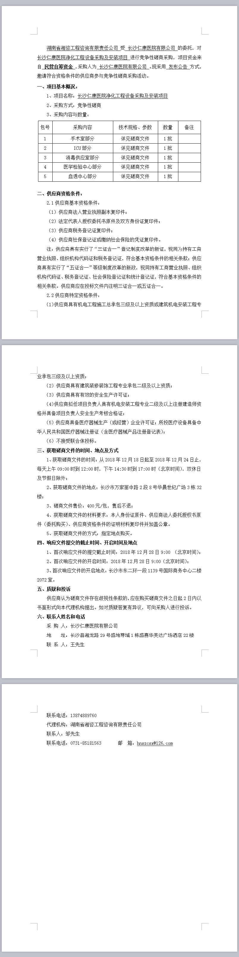長沙仁康醫(yī)院凈化工程設(shè)備采購及安裝項(xiàng)目磋商邀請公告