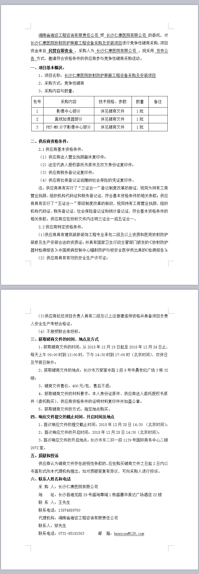 長沙仁康醫(yī)院放射防護屏蔽工程設(shè)備采購及安裝項目磋商邀請公告