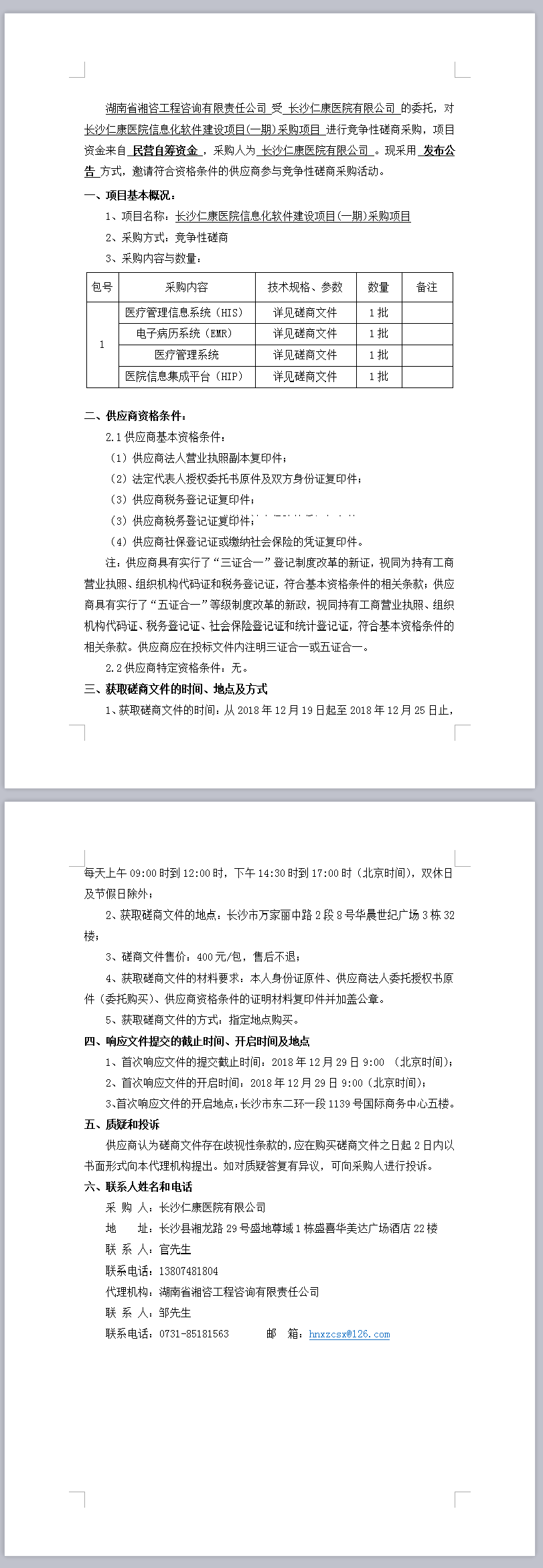 長沙仁康醫(yī)院信息化軟件建設(shè)項(xiàng)目(一期)采購項(xiàng)目磋商邀請公告
