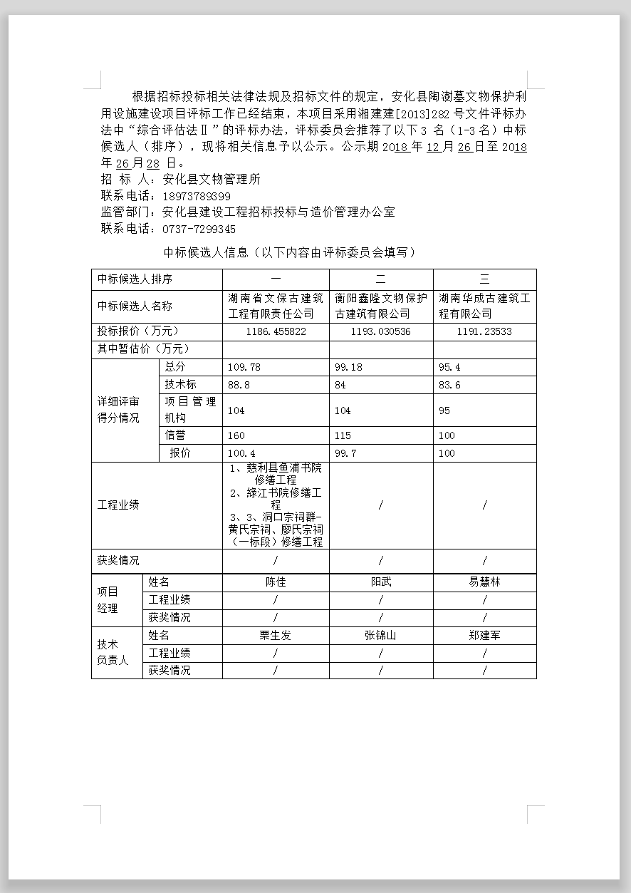 安化縣陶澍墓文物保護(hù)利用設(shè)施建設(shè)項(xiàng)目招標(biāo)投標(biāo)信息公示表