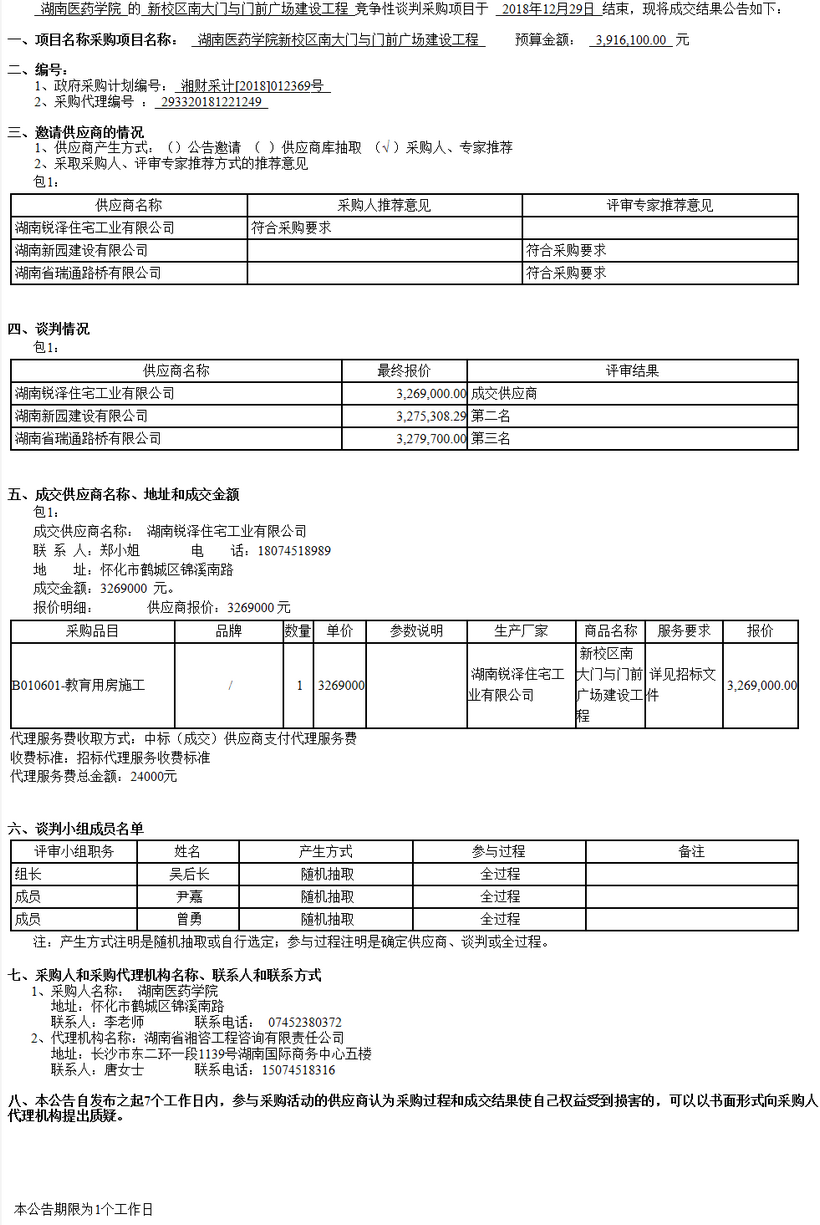 湖南醫(yī)藥學(xué)院新校區(qū)一期南大門與門前廣場(chǎng)工程談判成交公告