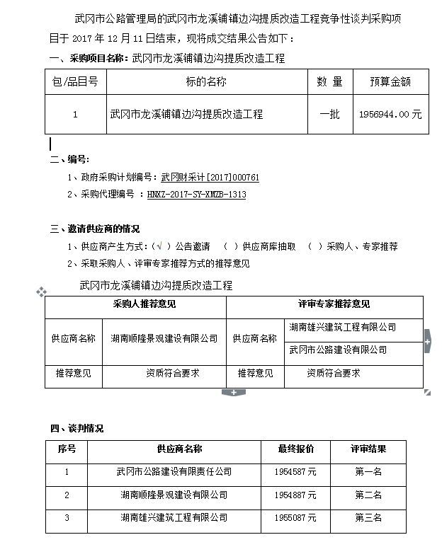 武岡市龍溪鋪鎮(zhèn)邊溝提質(zhì)改造工程 競爭性談判成交結(jié)果公告