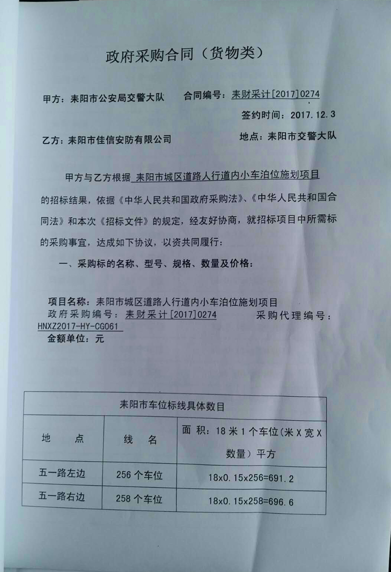 耒陽市城區(qū)道路人行道內(nèi)小車泊位施劃項目合同公示