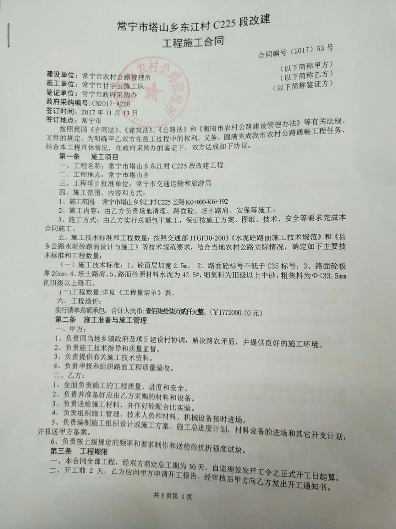 常寧市塔山鄉(xiāng)東江村C225段改建工程合同公示