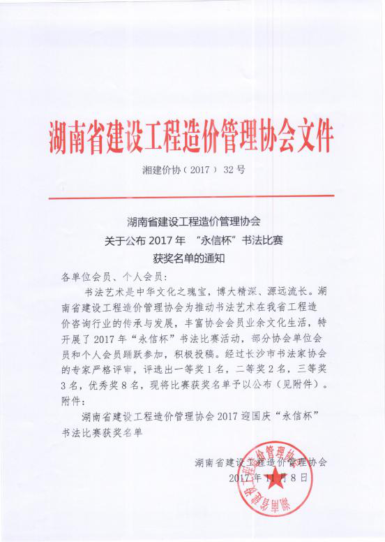 【喜訊】熱烈祝賀我司王佳勇在湖南省建設(shè)工程造價管理協(xié)會2017年 “永信杯”書法比賽獲得二等獎
