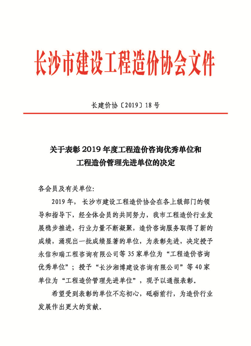 【喜訊】熱烈慶祝我司榮獲長沙市建設工程造價協會2019年度工程造價咨詢優(yōu)秀單位