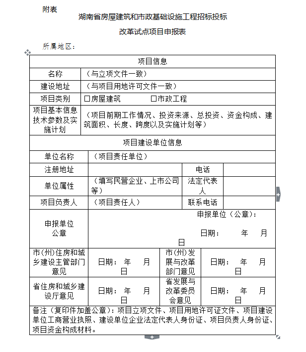 1.申報(bào)材料。項(xiàng)目申報(bào)單位可根據(jù)《試點(diǎn)方案》要求,填寫《湖南省房屋建筑和市政基礎(chǔ)設(shè)施工程招標(biāo)投標(biāo)改革試點(diǎn)項(xiàng)目申報(bào)表》(可在湖南省建設(shè)工程招標(biāo)投標(biāo)網(wǎng)http://www.hnztb.org/自行下載),并將其他相關(guān)材料編制成冊(一式三份蹋并附全套資料的電子文檔。