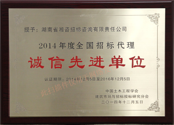 熱烈慶祝我司榮獲2014年度全國(guó)招標(biāo)代理誠(chéng)信先進(jìn)單位