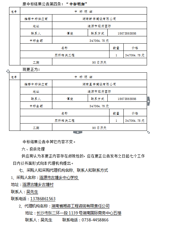 漣源市古塘中心學校廁所建設項目采購中標結果更正公告