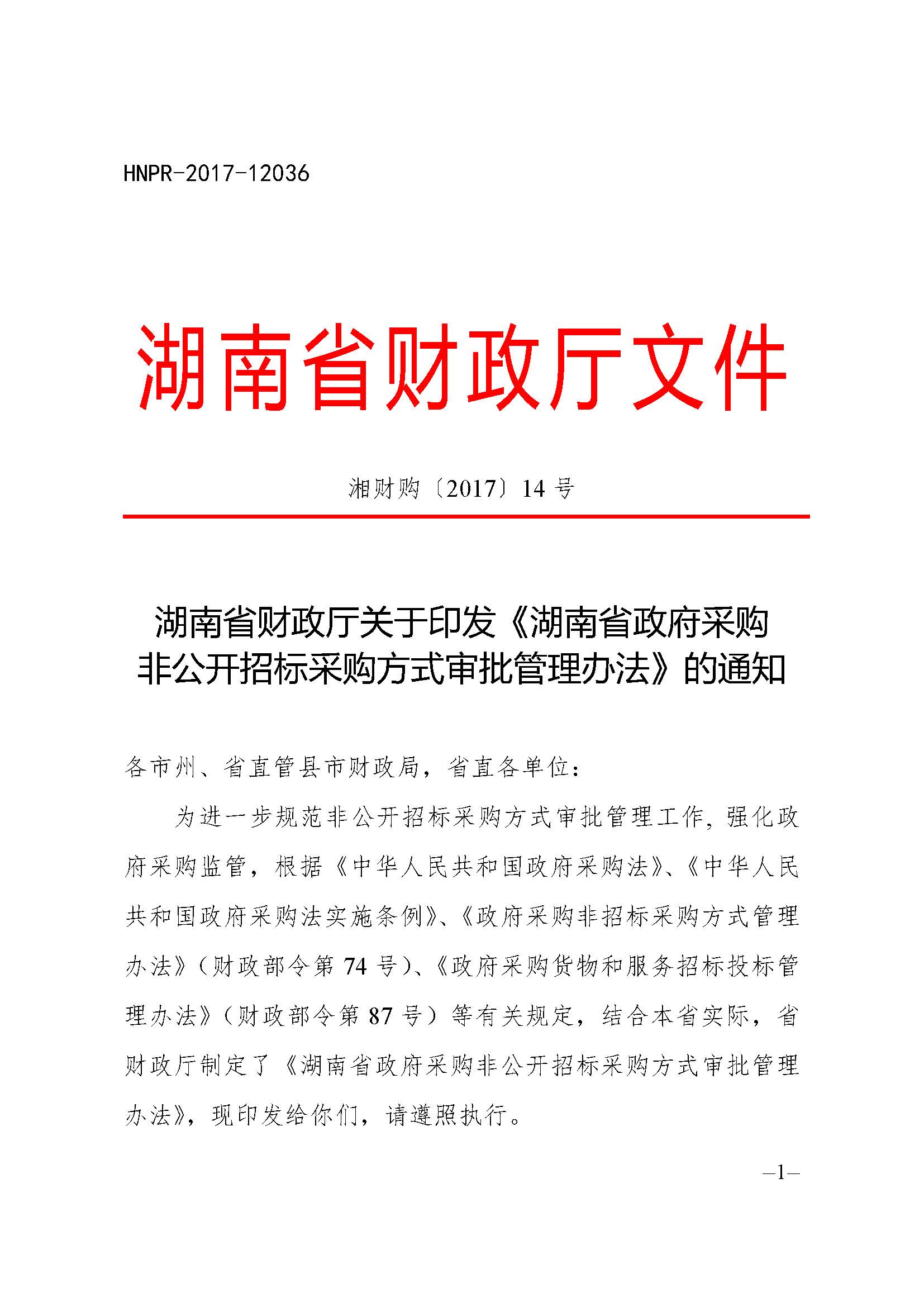 湖南省財(cái)政廳關(guān)于印發(fā)《湖南省政府采購 非公開招標(biāo)采購方式審批管理辦法》的通知