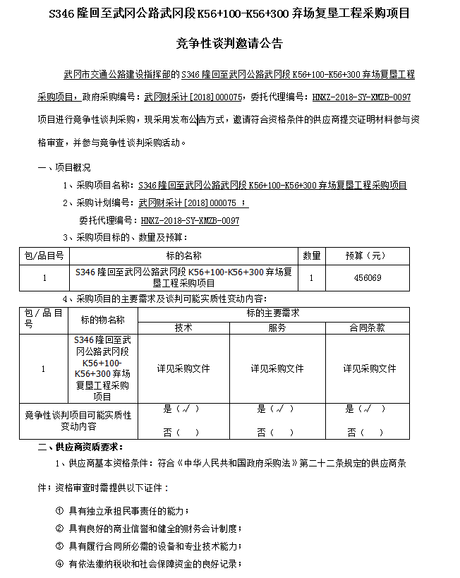S346隆回至武岡公路武岡段K56+100-K56+300棄場(chǎng)復(fù)墾工程采購項(xiàng)目 競爭性談判邀請(qǐng)公告