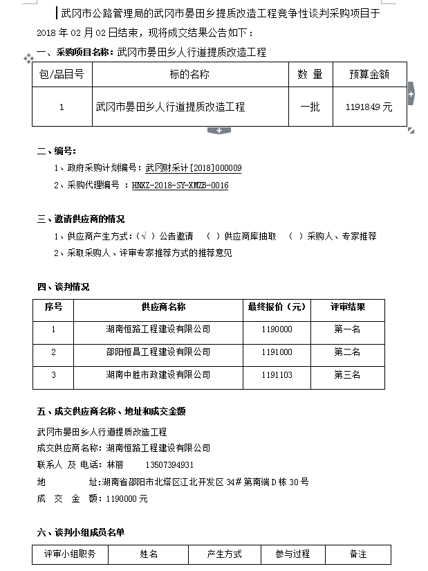 武岡市晏田鄉(xiāng)人行道提質(zhì)改造工程 競(jìng)爭(zhēng)性談判成交結(jié)果公告