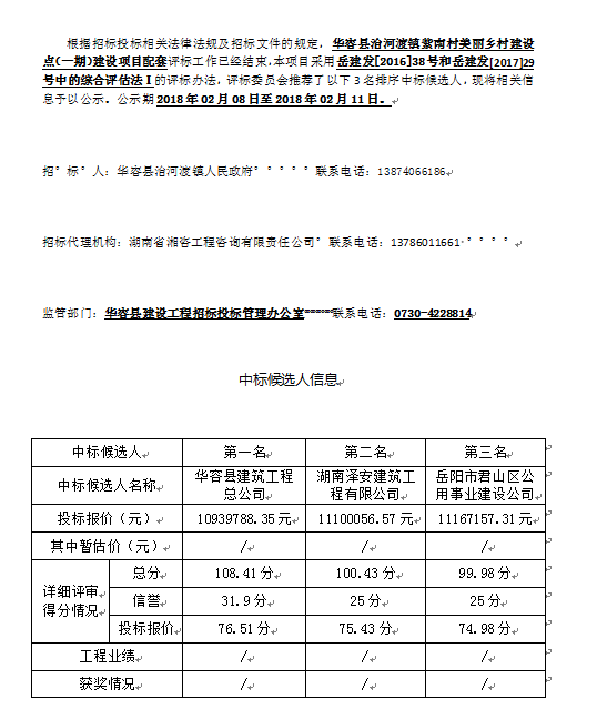 華容縣治河渡鎮(zhèn)紫南村美麗鄉(xiāng)村建設(shè)點(diǎn)(一期)建設(shè)項(xiàng)目配套中標(biāo)候選人公示