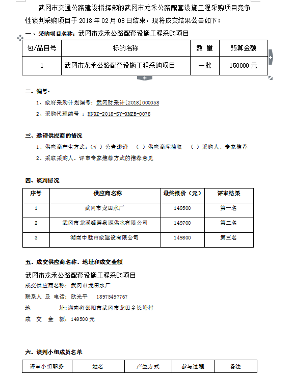 武岡市龍禾公路配套設(shè)施工程采購項(xiàng)目 競爭性談判成交結(jié)果公告