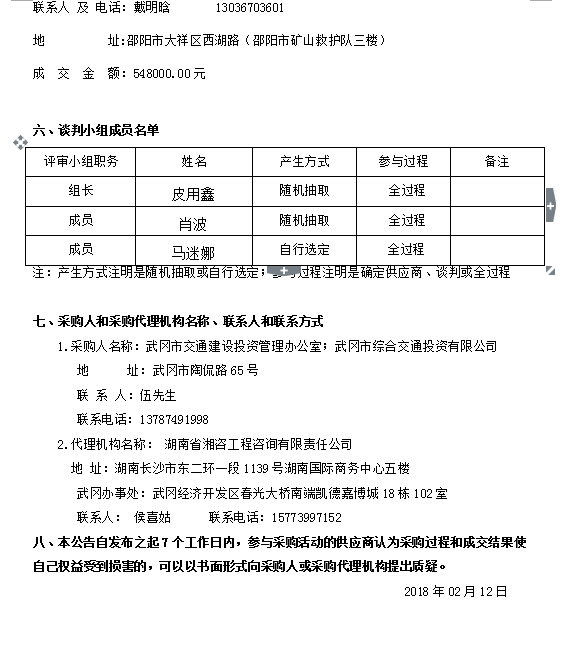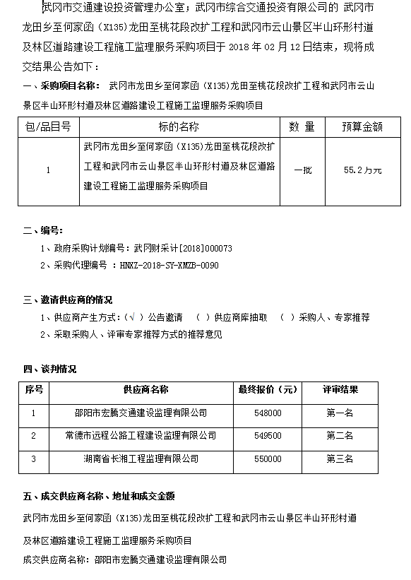 武岡市龍?zhí)镟l(xiāng)至何家函(X135)龍?zhí)镏撂一ǘ胃臄U工程和武岡市云山景區(qū)半山環(huán)形村道及林區(qū)道路建設(shè)工程施工監(jiān)理服務(wù)采購項目 競爭性談判成交結(jié)果公告