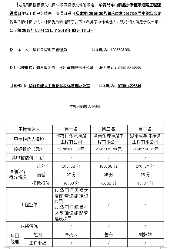 華容縣東山鎮(zhèn)起步新區(qū)等道路工程建設(shè)項(xiàng)目中標(biāo)候選人公示