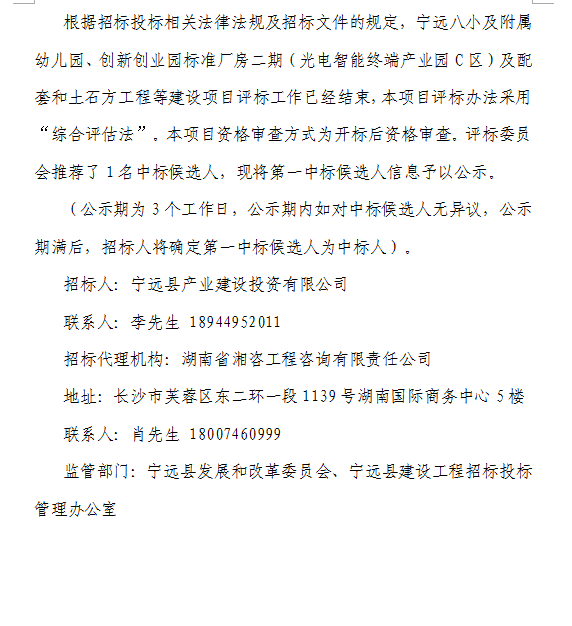 寧遠(yuǎn)八小及附屬幼兒園、創(chuàng)新創(chuàng)業(yè)園標(biāo)準(zhǔn)廠房二期(光電智能終端產(chǎn)業(yè)園C區(qū))及配套和土石方工程等建設(shè)項(xiàng)目中標(biāo)候選人信息公示