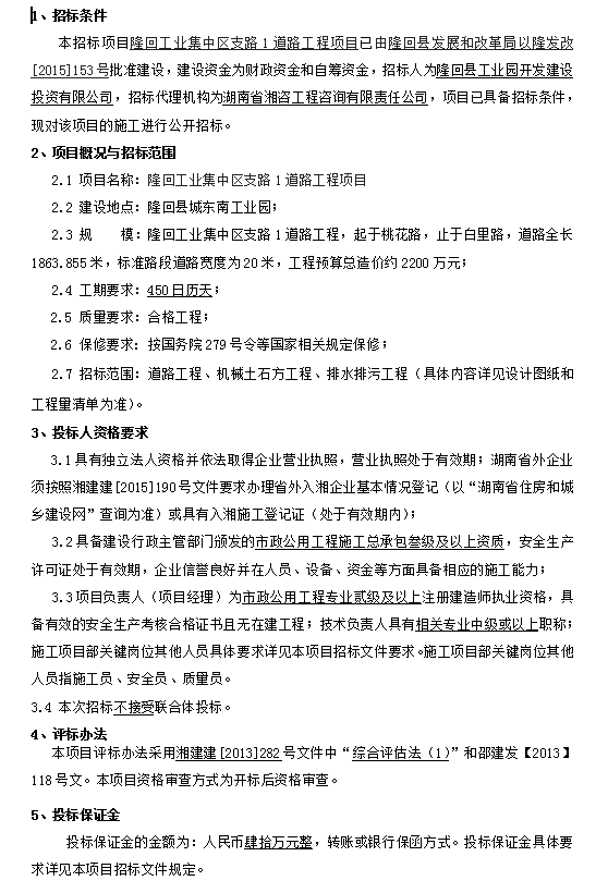 隆回工業(yè)集中區(qū)支路1道路工程項(xiàng)目招標(biāo)公告