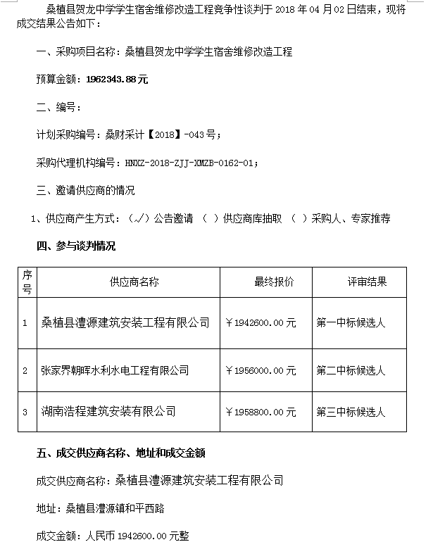 桑植縣賀龍中學(xué)學(xué)生宿舍維修改造工程競(jìng)爭(zhēng)性談判 成交結(jié)果公告