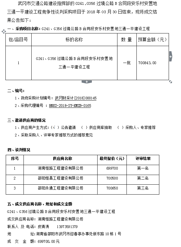 G241、G356過(guò)境公路B合同段安樂(lè)村安置地三通一平建設(shè)工程  競(jìng)爭(zhēng)性談判成交結(jié)果公告