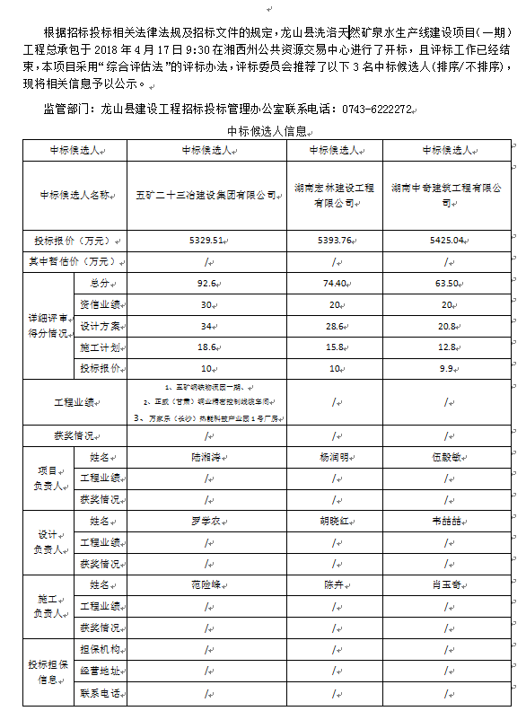 龍山縣洗洛天然礦泉水生產(chǎn)線建設項目(一期)工程總承包中標候選人公示