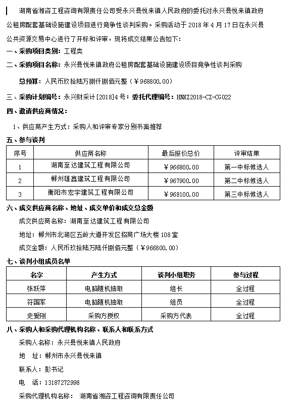 永興縣悅來鎮(zhèn)政府公租房配套基礎(chǔ)設(shè)施建設(shè)項(xiàng)目競爭性談判采購成交公告