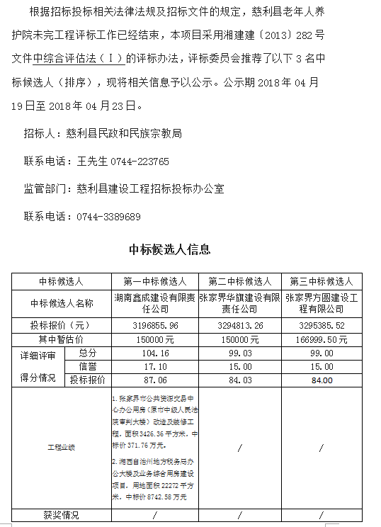 慈利縣老年人養(yǎng)護院未完工程施工招標 中標候選人公示