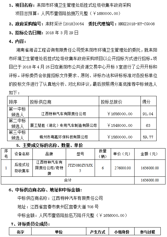 耒陽市環(huán)境衛(wèi)生管理處后掛式垃圾收集車政府采購 評標(biāo)結(jié)果公示