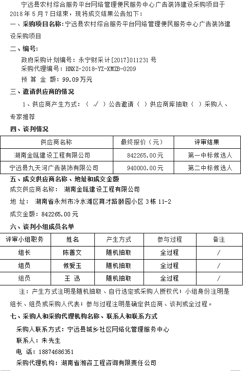 寧遠(yuǎn)縣農(nóng)村綜合服務(wù)平臺(tái)網(wǎng)絡(luò)管理便民服務(wù)中心廣告裝飾建設(shè)采購項(xiàng)目競(jìng)爭性談判成交公告