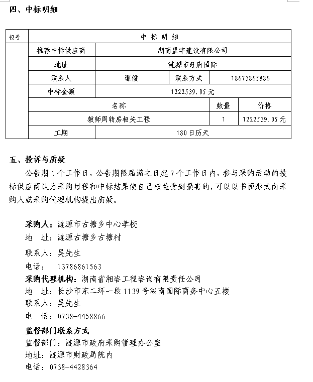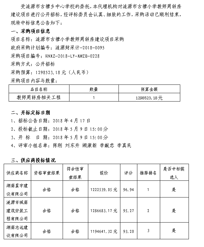 漣源市古塘小學(xué)教師周轉(zhuǎn)房建設(shè)項(xiàng)目采購(gòu)中標(biāo)結(jié)果公告